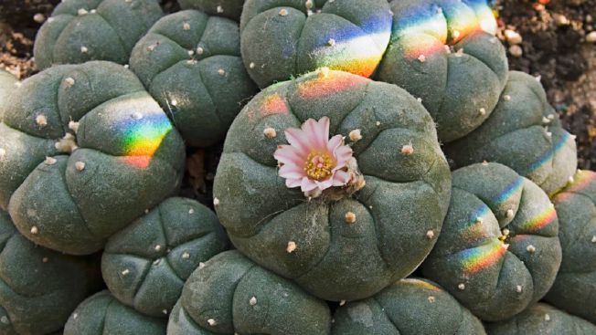 Elpeyote (lophophora williamsii) es una cactácea originaria del desierto del norte de México y sur de Estados Unidos cuyas propiedades medicinales y enteógenas han sido ampliamente debatidas, satanizadas, pero también estudiadas y aprovechadas desde hace cientos de años por las naciones huichol y tarahumara, entre muchas otras. Mide unos 12cm de diámetro y su color va del verde oscuro al gris azulado, presentando vellosidades blancas parecidas a plumas de algodón y en ocasiones una flor blanca o rosa que crece en su centro. Su raíz es cónica y se hunde profundamente en la tierra, mientras que el